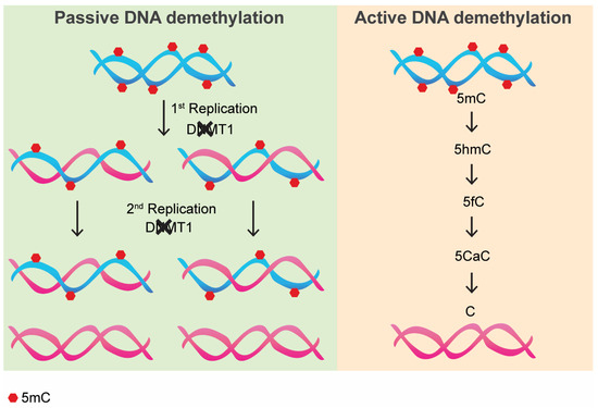 In addition, following 5hmC, there can be the generation of a C via the passive dilution mechanism, which takes into account the “dispersion” of the modification on C after several rounds of DNA replication [13,30].