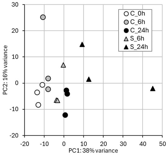Results of PCA of gene expression data. Samples are generally clustered based on treatment type (C, control vs. S, self−DNA) and timing (0 h, 6 h, and 24 h) according to the variance explained by PC1 (38%) and PC2 (16%).