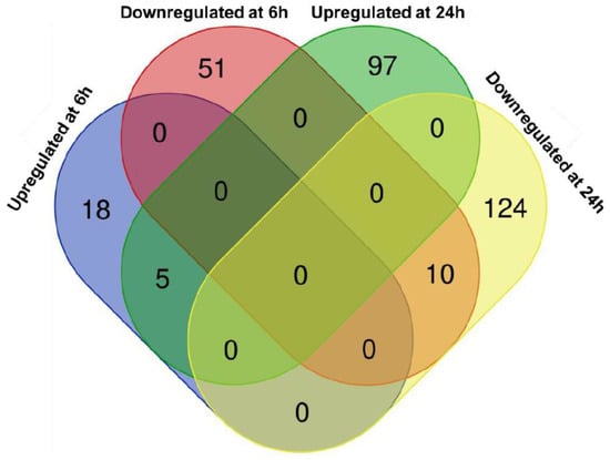 Venn diagram showing numbers of differentially expressed genes (DEGs) in each of the four groups (upregulated at 6 h, downregulated at 6 h, upregulated at 24 h, and downregulated at 24 h).