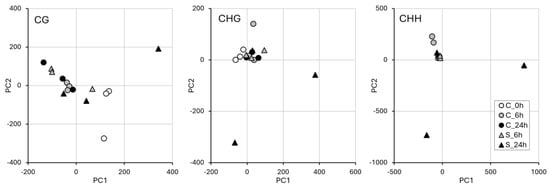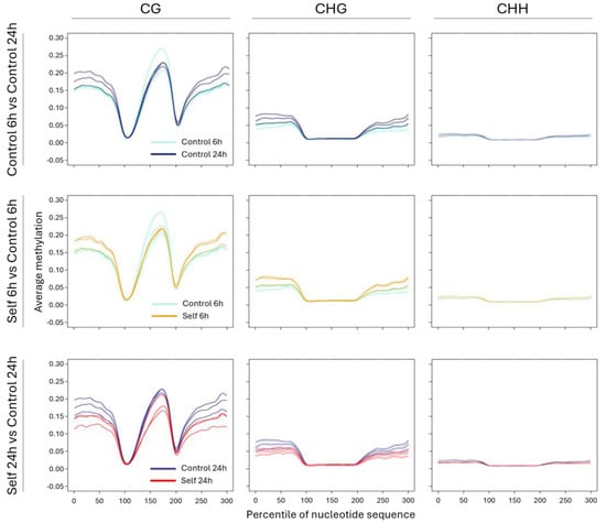 The exploratory PCA analysis (Figure 4) showed clear differences among the samples in the different methylation contexts (CG, CHG, and CHH). In particular, for the samples exposed to self-DNA for 24 h, there is an evident segregation of samples in the CHG and CHH contexts, whereas, in the CG context, most samples appear clustered, with only one self-treated sample resulting in separation along the first component, as in the other contexts. However, also in the control, an outlier sample was found in all the contexts. Distances among the three self-DNA-treated samples at 24 h could be related to overall read counts (Supplementary Table S2). In the other two methylation contexts (CHG and CHH), the sample spreading is similar, with a main cluster around the origin, a divergence of the outlier control sample (more evident in the CHG context), and a clear separation of two samples exposed to self-DNA for 24 h from the main cluster.