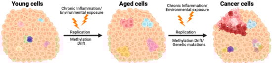 Although cells within tissues and organs share the same genomic DNA, they perform different functions and express different genes. Even cells from homogeneous or clonal populations display cell-to-cell heterogeneity [91,92]. Single-cell analysis has revealed phenotypic heterogeneity in clonal populations that affects transcription factors and cellular signaling [93]. Even human induced pluripotent cells (iPSCs) have different subpopulations of cells with different cell state transitions [94]. A key source of cellular heterogeneity is epigenetic mosaicism. As previously mentioned, DNA methylation errors gradually accumulate, leading to disrupted gene regulation. These errors are not isolated to individual cells; instead, they are faithfully inherited by daughter cells during cell division. This propagation of methylation errors across cellular generations contributes to the gradual decline in cellular function and the onset of age-related conditions. These age-related heterogeneous changes can only be attributed to the process of stochastic methylation drift, where random fluctuations in DNA methylation patterns accumulate over time, leading to variability in gene expression and cellular function.