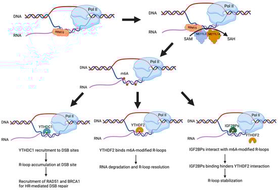 Reciprocal regulation between R-loop dynamics and m6A modification. R-loops can serve as platforms for RNA-binding proteins such as RBM15, which recruit the METTL3-METTL14 m6A methyltransferase complex to deposit m6A marks on nascent RNA within R-loops, using S-adenosylmethionine (SAM) as the methyl donor. The resulting m6A-modified R-loops are recognized by distinct m6A reader proteins such as YTHDC1, YTHDF2, and IGF2BPs. YTHDC1 accumulates at DSB sites, promoting R-loop accumulation and recruiting homologous recombination repair factors such as RAD51 and BRCA1. YTHDF2 facilitates degradation of m6A-marked RNA within R-loops, promoting their resolution. In contrast, IGF2BPs stabilize R-loops by binding m6A-modified RNA and preventing YTHDF2-mediated resolution. Together, these interactions illustrate the dynamic regulation between R-loops and m6A (created with Biorender.com, accessed on 10 June 2025).