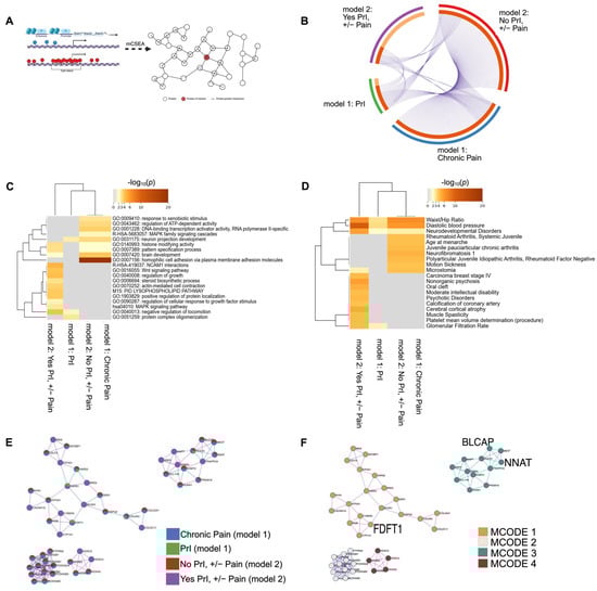 DMR analysis in features known to regulate gene expression identifies several shared genes, promoters and CpG islands associated with recurrent PrI history, chronic pain, and chronic pain given PrI history. (A) mCSEA interrogates probes in pre-defined genomic regions specifically related to changes in gene expression. Genes and genes associated with promoters were used as input for annotation/enrichment analysis and protein–protein interaction network analysis using MetaScape. (B) Circos plot shows shared features between phenotype groups: PrI, Pain, and stratified groups by PrI history. (C) Heatmap depicting top twenty clusters of gene-ontology terms associated with each phenotype group. p-values are unadjusted and log-scaled. (D) Heatmap of unadjusted p-values for enrichment of genetic features from each phenotype group with genes known with certain pathologies and other conditions. p-values are unadjusted and log-scaled. (E,F) Protein–protein interaction network after being processed by MCODE algorithm using MetaScape. (E) Each circle is a pie-graph depicting relative number of genes as input from each phenotype group. (F) Each cluster from E depicting associated MCODE term or terms enriched in most densely connected nodes of network (Table 7). Created in MetaScape and BioRender. Alcorn, M. (2025) https://biorender.com/zlhriev (accessed on 3 July 2025).