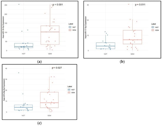 Expression levels of hsa-miR-16-5p (a), hsa-miR-17-5p (b), and hsa-miR-20a-5p (c) in pregnant individuals with GDM and normoglycemia (NGT). The median and interquartile range values are given in the box, and the highest and lowest values are given in the whiskers. As the data was not distributed normally, the two-sample Wilcoxon test was used for comparison of data in two groups.