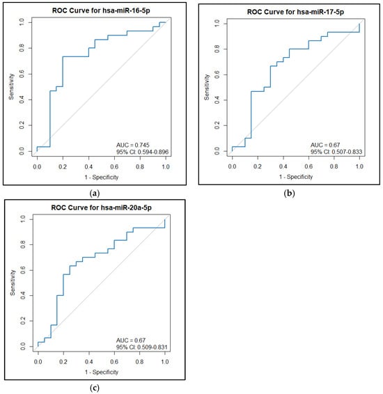 BMI, SBP, and TG were found to be significantly higher in the GDM group as compared to the NGT group. However, LDL-c was significantly lower in the GDM group as compared to the NGT group. All three miRNAs, hsa-miR-16-5p (p = 0.004), hsa-miR-17-5p (p = 0.044), and hsa-miR-20a-5p (p = 0.044), were found to be significantly overexpressed in the GDM group compared to the NGT group, as shown in Table 1 and Figure 1. The diagnostic utility of these miRNAs was assessed using an ROC curve analysis. In ROC curve analysis, hsa-miR-16-5p showed an AUC of 0.745 and a sensitivity of 0.733 (0.833–1) at a specificity of 0.8 (0.4–0.95) with a cut-off of 44.38. hsa-miR-17-5p showed an AUC of 0.67 and a sensitivity of 0.667 (0.7–1) at a specificity of 0.7 (0.4–0.9) with a cut-off of 6.312. hsa-miR-20a-5p showed an AUC of 0.67 and a sensitivity of 0.633 (0.7–1) at a specificity of 0.75 (0.35–0.95) with a cut-off of 7.299 (Figure 2).