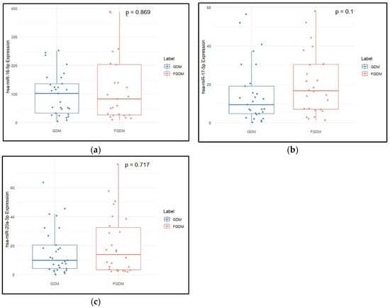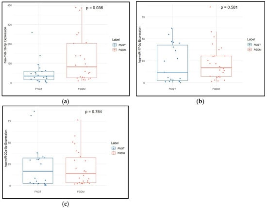 Expression levels of (a) hsa-miR-16-5p, (b) hsa-miR-17-5p, and (c) hsa-miR-20a-5p in post-delivery individuals with GDM and normoglycemia. The median and interquartile range values are given in the box, and the highest and lowest values are given in the whiskers. As the data was not distributed normally, the two-sample Wilcoxon test was used for comparison of data in two groups.