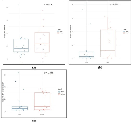 Expression levels of (a) hsa-miR-16-5p, (b) hsa-miR-17-5p, and (c) hsa-miR-20a-5p in post-delivery individuals with normoglycemia (FNGT) and their corresponding samples during pregnancy (NGT). The median and interquartile range values are given in the box, and the highest and lowest values are given in the whiskers. As the data was not distributed normally, the two-sample Wilcoxon test was used for comparison of data in two groups.