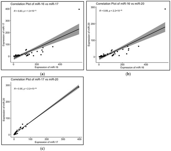Correlation analysis of (a) hsa-miR-16-5p with hsa-miR-17-5p, (b) hsa-miR-16 with hsa-miR-20a-5p, and (c) hsa-miR-17-5p with hsa-miR-20a-5p.