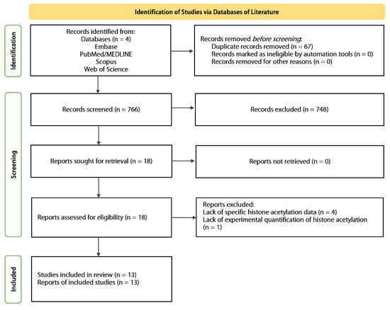 Exclusion criteria included (1) studies that did not explicitly report alterations in histone acetylation enrichment, (2) only mentioned anticancer agents capable of altering histone modifying enzymes without specifying histone acetylation measurements, or (3) lacked sufficient methodological details about the cancer models where histone acetylation status was determined. Review articles, editorial materials, commentaries, perspectives, and abstracts were also excluded.