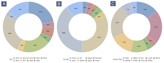 Frequency of publication year (A), country of origin (B), and cancer types (C) among the included studies. Note: All plots were generated based on the count of experimental entries (N = 28). (BLCA: bladder cancer; BRCA: breast cancer; CCA: cholangiocarcinoma; CRC: colorectal cancer; LUAD: lung cancer; OV: ovarian cancer; PDAC: pancreatic ductal adenocarcinoma; PRAD: prostate adenocarcinoma; SKCM: skin cutaneous melanoma.