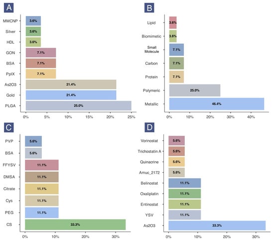Frequency of nanomaterial type (A), nanomaterial class (B), surface functionalization (C), and anticancer agent (D) in the included nanotherapeutics. Note: All plots were generated based on the count of experimental entries (N = 28). (BAS: bovine serum albumin; CS: chitosan; Cys: cysteamine; DMSA: dimercaptosuccinic acid; FFYSV: L-phenylalanine-L-phenylalanine-tyroservatide; GON: graphene oxide nanosheet; HDL: high-density lipoprotein; MMNCP: macrophage membrane-coated nanoparticle; PEG: polyethylene glycol; PLGA: poly(lactic-co-glycolic acid); PpIX: protoporphyrin IX; PVP: polyvinylpyrrolidone).