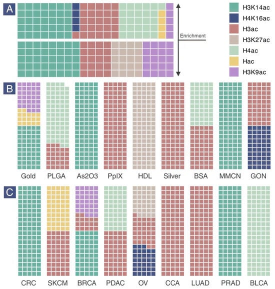 Distribution of histone acetylation marks based on enrichment pattern (A), nanomaterial type (B), and cancer type (C). Note: All plots were generated based on the count of experimental entries (N = 28). (BSA: bovine serum albumin; BLCA: bladder cancer; BRCA: breast cancer; CCA: cholangiocarcinoma; CRC: colorectal cancer; GON: graphene oxide nanosheet; HDL: high-density lipoprotein; LUAD: lung adenocarcinoma; MMCN: macrophage membrane-coated nanoparticle; OV: ovarian cancer; PDAC: pancreatic ductal adenocarcinoma; PLGA: poly(lactic-co-glycolic acid); PpIX: protoporphyrin IX; PRAD: prostate adenocarcinoma; SKCM: skin cutaneous melanoma).
