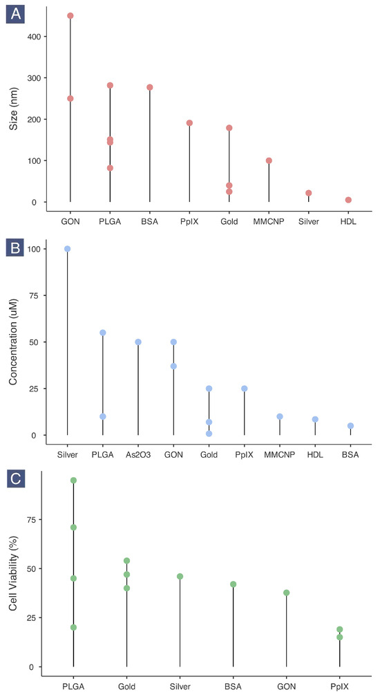Lollipop plots of size (A), concentration (B), and cell viability (C) divided by nanomaterial classification. Note: Each dot represents a specific value reported for the variable. Plots are ordered to show efficiency in terms of size, dosage, and anticancer effect. (BSA: bovine serum albumin; GON: graphene oxide nanosheet; HDL: high-density lipoprotein; MMCNP: macrophage membrane-coated nanoparticle; PLGA: poly(lactic-co-glycolic acid); PpIX: protoporphyrin IX).