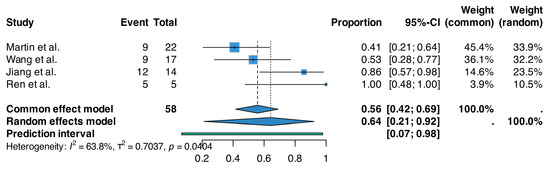 A random-effects meta-analysis of proportions demonstrated that treatment with the evaluated nanotherapeutics led to tumor size reduction to less than 50% of that observed in the corresponding control groups in 64% (95% CI: 21–92%, p = 0.040) of animals across the included studies with moderate to high heterogeneity (n = 58, I2 = 63.8%) (Figure 6).