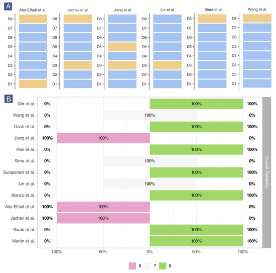 Risk of bias assessment of the included studies [72,73,74,75,76,77,78,79,80,81,82,83,84] based on ToxRTool. (A) Stacked boxplots of domains by study label, showing yes/no responses for each domain. Blue indicates “yes”, yellow indicates “no”. (B) Likert plot of reliability scores showing studies grouped by scores of 6, 7, or 8.