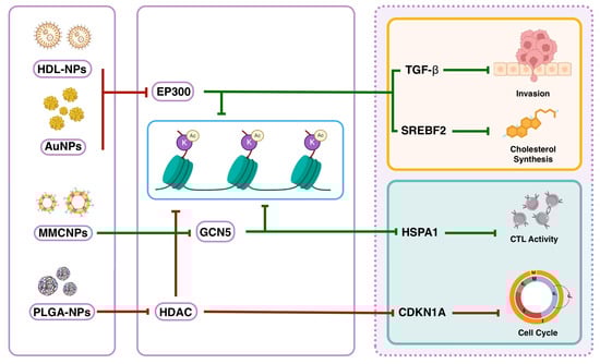 Concurrently, nanotherapeutics induce the upregulation of CDKN1A (p21) through two complementary pathways, i.e., direct H3K14ac reduction (via EP300/CBP inhibition) and HDAC inhibition-mediated H3 acetylation [82,83]. CDKN1A activation enforces G1/S cell cycle arrest, preventing DNA replication in stressed cells and sensitizing them to apoptosis [111,112]. This effect can potentially be amplified by HSPA1 hyperacetylation—driven by GCN5-mediated H3K14ac enhancement—which overwhelms proteostasis [113]. Despite its canonical pro-survival role, sustained HSPA1 overexpression enhances cytotoxic T lymphocyte (CTL)-mediated immune response, which has been confirmed in colorectal cancer cells exposed to MMNCPs carrying a GCN5 analogue [75]. Critically, CDKNA1-mediated cell cycle arrest and HSPA1-induced CTL response to bypass common resistance mechanisms through senescence or apoptosis [75,112]. This integrated mechanism—simultaneously targeting TGF-β/SREBF2 to disable invasion and metabolism, and HSPA1/CDKN1A to enforce cell death—explains the superior efficacy of nanotherapeutics. Figure 8 shows a simplified illustration of this putative mechanistic crosstalk.