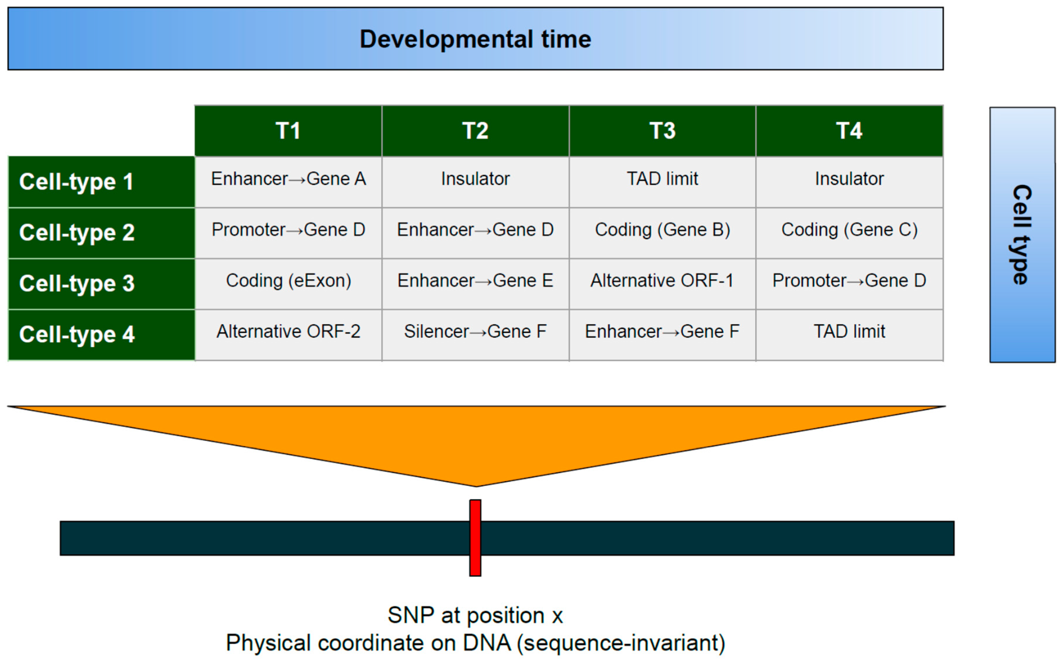 | Contextual risk allele | A genetic variant whose effect on disease is context dependent. Its functional identity changes across cell types, developmental stages, or environmental states, reflecting the epigenomic processes that embed it in different emergent genomic functional identities. |