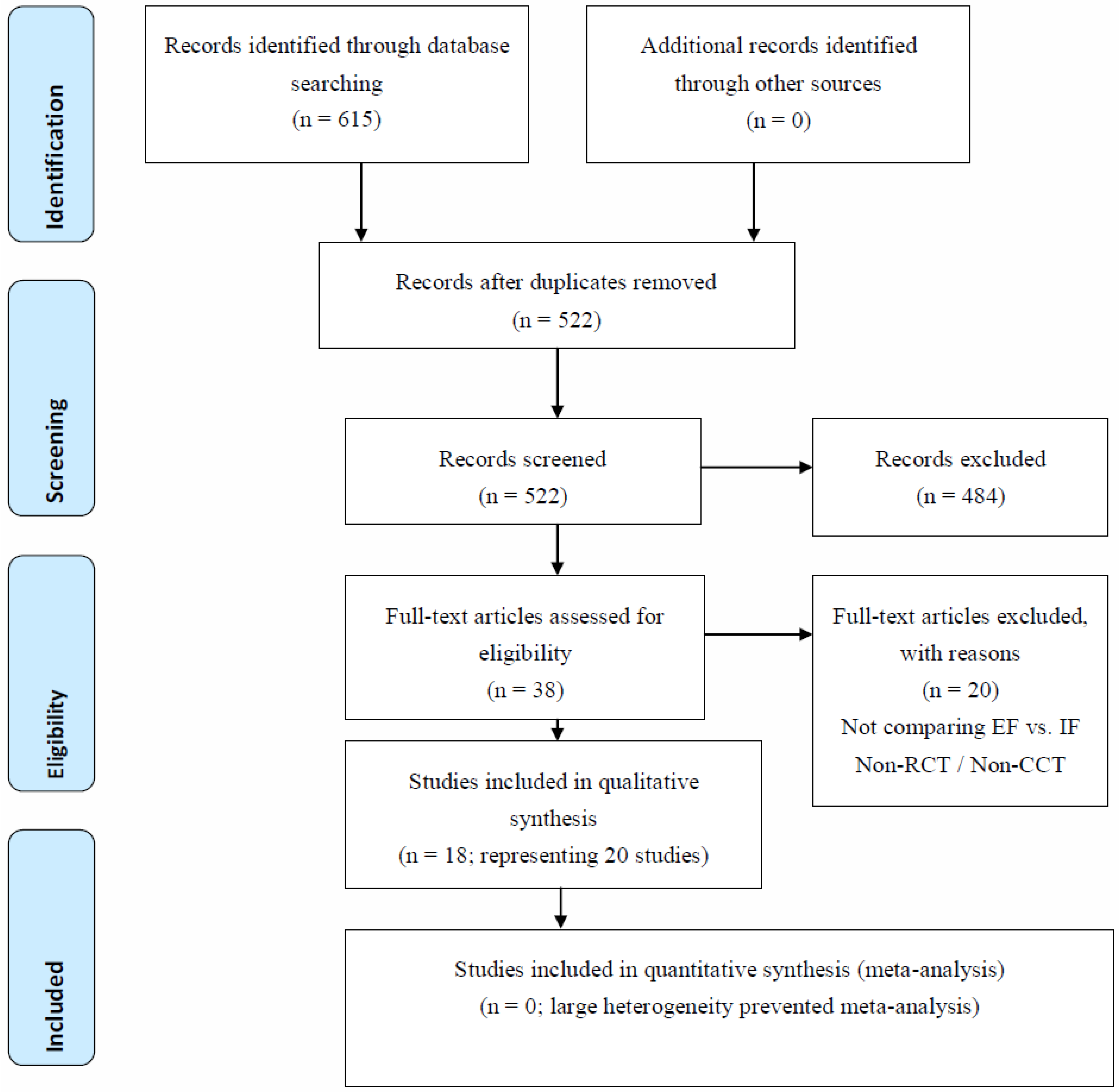 The 20 RCTs (written down in 18 different reports) in this systematic review included 725 participants. One trial reported the effect of EF and IF on stroke patients [30]. Two reports from one trial [25,26] reported the effect of IF and EF on 40 and 36 ankle sprain patients, respectively. One trial reported the effect on the elderly [29] and one in children and adults [32]. The remaining studies used students [15,19,28,33,34,35,36,37,38,39], (young) adults [27,40] and gymnasts [31].