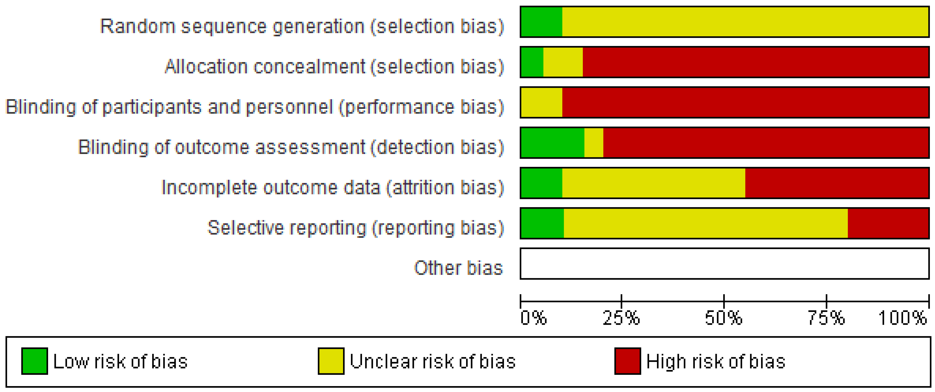 Two reviewers (RK and EDB) independently applied the Cochrane Collaboration’s tool for assessing risk of bias (ROB) to assess the risk of over- or under-estimating the effects of an intervention [23]. Nine items, with each having three rating categories, were scored and divided into six domains of bias (Figure 2, Figure 3) [23]: (1) low ROB, (2) unclear ROB and (3) high ROB. Rating (1) is unlikely to alter the results significantly, (2) raises some doubt about the results and (3) seriously weakens confidence in the results. With insufficient information on an item, the score given was “high risk”.