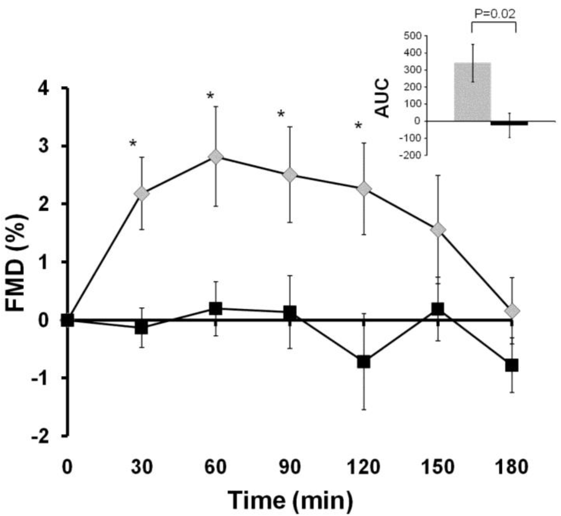 Acute changes in FMD were measured after administration of the following treatments in random order, (1) 600 mg of a proprietary blend of polyphenols from cranberries (Vaccinium macrocarpon) and grape seeds (Vitis vinifera) commercialized as CranLoad™, mixed in 500 mL of water, and (2) after polyphenol-free carbohydrate-matched and flavor-matched placebo drink (500 mL). Both beverages contained equal quantities of carbohydrates (6%) from identical sources. FMD was assessed over a three-hour period at pre-determined time points (0, 30, 60, 90, 120, 150, and 180 min).
