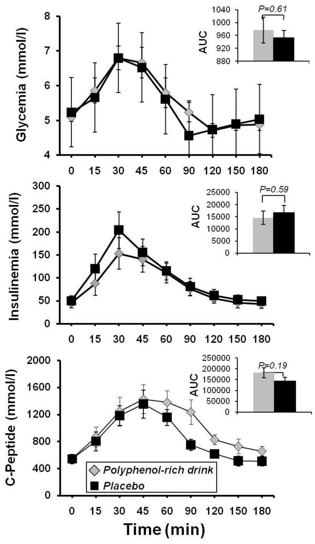 Glycemia, insulinemia, and C-Peptide concentration at baseline and after the ingestion of the polyphenol-rich drink or placebo in elite athletes. The inserts present the area under the curve (AUC) of the change over time above baseline (time 0) values. The Y axis for the inserts is in mmol/L*min. There was no statistical difference between treatments.