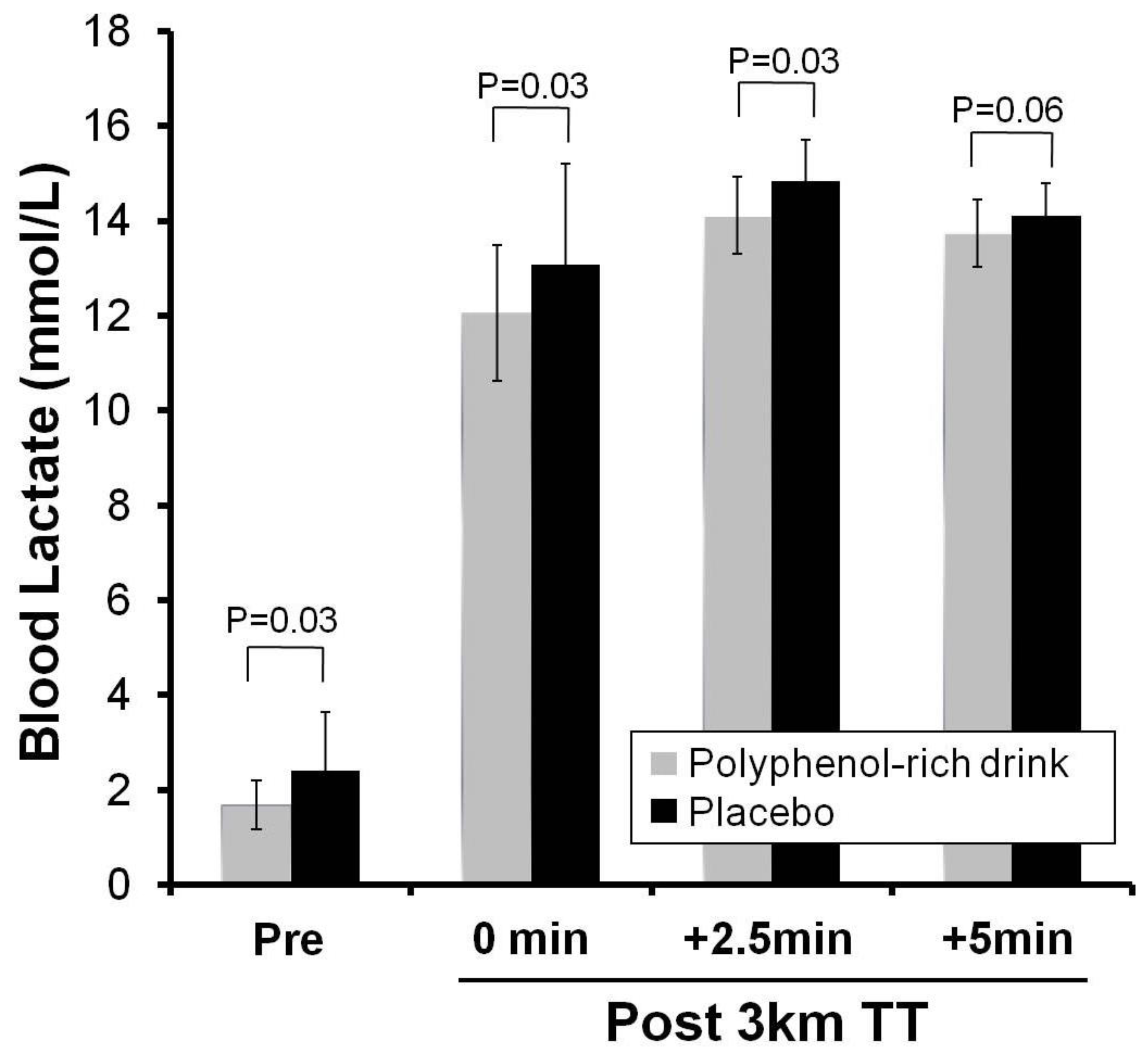 Time to completion of the 3-km TT was virtually identical between the two treatments (267.5 ± 24.5 s vs. 265.7 ± 21.4 s with the polyphenol-rich and placebo treatments respectively) and the difference between the two (1.75 s, 0.66%) was not significant (p = 0.27). There was also no difference in average wattage and perceived exertion after the TT between the polyphenol-rich and placebo drinks. There was no apparent indication that sequence of treatments (placebo first or polyphenol first) had any influence on the outcomes (not shown). However, consumption of polyphenols 60 min before the TT was associated with lower plasma lactate concentrations both before the onset of the test (−0.7 mmol/L, −30.3%), as well as immediately following the test (−1.0 mmol/L, −7.9%), and 2.5 min post recovery (−0.7 mmol/L, −4.8%, Figure 3, p < 0.05). Heart rates (HR) at the end of the 3-km TT were comparable after both conditions (polyphenol-rich drink: 188 ± 6 bpm, placebo: 190 ± 6 bpm, p = 0.22). However, HR was significantly lower 2 min post exercise (140 ± 10 vs. 144 ± 9 bpm, p = 0.04, N = 11) and 5 min post exercise (120 ± 7 vs. 122 ± 8 bpm, p = 0.05, N = 10) after the polyphenol-rich drink vs. placebo. No side effect was reported by the athletes in response to either treatment.