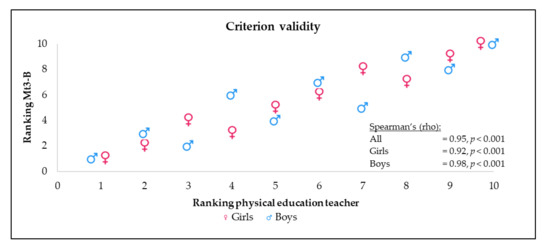 Criterion validity was evident by a high Spearman’s correlation coefficient (rho = 0.95, p < 0.001) between the two rank scores (teacher ranking and ranking from Mt3-B), which was found to be somewhat lower for girls (rho = 0.92, p < 0.001) than boys (rho = 0.98, p < 0.001) (Figure 1).