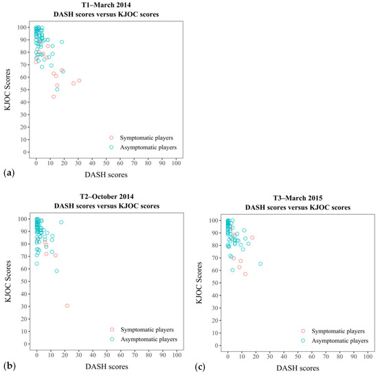 Scatterplot shows the summed KJOC scores plotted against the DASH scores for the first measurement (a), second measurement (b) and third measurement (c) for the asymptomatic players and symptomatic players with upper extremity symptoms.