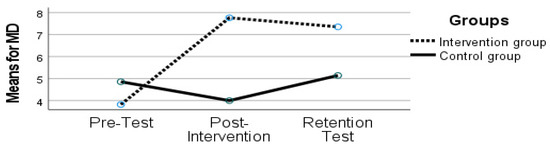 The findings have demonstrated an effect of time (F (2, 21) = 1.149, p = 0.336, ηp2 = 0.099), and there was an interaction between time and group (F (2, 21) = 6.673, p = 0.006, ηp2 = 0.389), as can be seen in Figure 4.