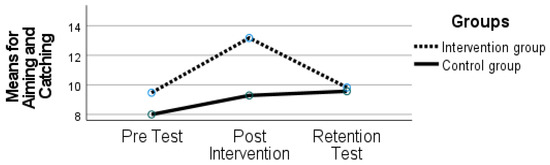 The research also shows that children with DCD may improve their aiming and catching abilities without intervention. This conclusion was also supported by other studies [17,18]. It is important to note, however, that the rate of development in aiming and catching abilities was greater in the intervention group than in the control group in the post-test and retention tests.