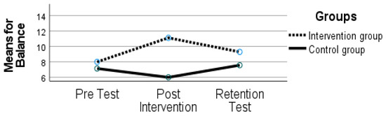A decline was evident (post-intervention: 13.17 ± 2.24; retention test: 9.82 ± 3.97), but change over time needed to be analyzed within each group separately. In the IG, an improvement was found from the pre- to post-intervention, and a decline was seen from the post-intervention period to the retention test (p < 0.050) back to the initial scores. The CG maintained their performance (p > 0.050).