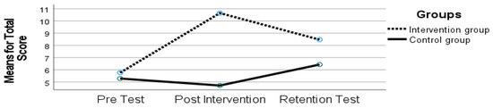 As seen in Figure 5, Total Score results have indicated an effect of time (F (2, 21) = 15.145, p < 0.001, ηp2 = 0.591) and an interaction between time and group (F (2, 21) = 23.108, p < 0.001, ηp2 = 0.688).