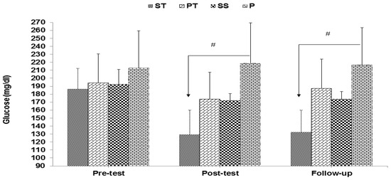 Figure 1. Glucose in the pre-test, post-test, and follow-up (mean ± SD). # indicates a significant decrease in the ST group compared to the P group.
