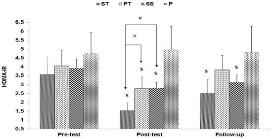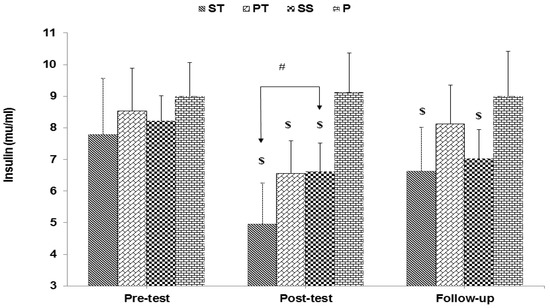 Figure 2. Insulin in the pre-test, post-test, and follow-up (mean ± SD). $ indicates a significant decrease in the ST, PT, and SS groups compared to the P group, and # indicates a significant decrease in the ST group compared to the SS group.