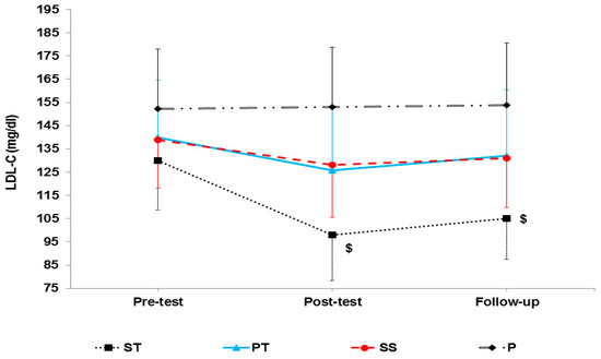 Figure 4. LDL-C levels in the pre-test, post-test, and follow-up. $ indicates a significant decrease in the ST group compared to the P group. $ indicates a significant decrease in the PT group compared to the P group.