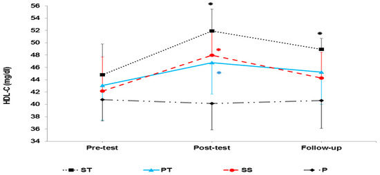 Figure 5. HDL-C levels in the pre-test, post-test, and follow-up. * indicates a significant increase in the ST, PT, and SS groups compared to the P group.