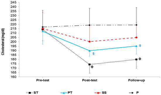 Figure 6. Cholesterol levels in the pre-test, post-test, and follow-up. ɸ indicates a significant decrease in the ST group compared to the SS and P groups. $ indicates a significant decrease in the PT group compared to the P group.