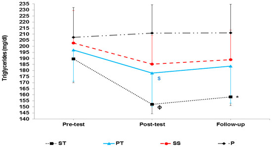 Figure 7. Triglyceride levels in the pre-test, post-test, and follow-up. ɸ indicates a significant decrease in the ST group compared to the SS and P groups, $ indicates a significant decrease in the PT group compared to the P group. * indicates a significant decrease in the ST group compared to the P group in the follow-up.