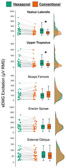 - Andersen, V.; Fimland, M.S.; Mo, D.-A.; Iversen, V.M.; Vederhus, T.; Rockland Hellebø, L.R.; Nordaune, K.I.; Saeterbakken, A.H. Electromyographic comparison of barbell deadlift, hex bar deadlift, and hip thrust exercises: A cross-over study. J. Strength Cond. Res. 2018, 32, 587–593. [Google Scholar] [CrossRef]