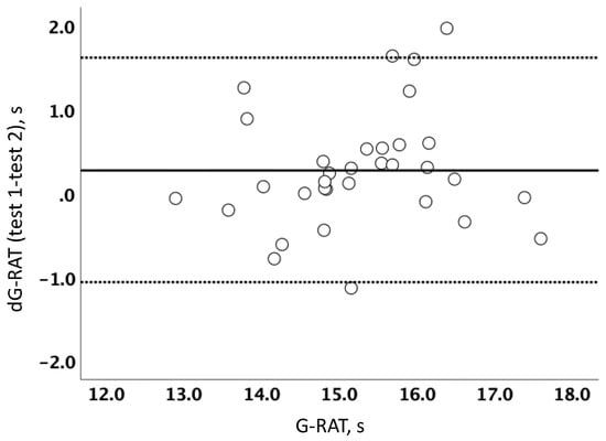 Bland–Altman plots for the total running times of the G-RAT. Solid and dotted lines denote means and lower and upper limits of agreement. G-RAT, goalkeeper-specific reactive agility test; dG-RAT, the difference between test 1 and test 2 in the G-RAT.
