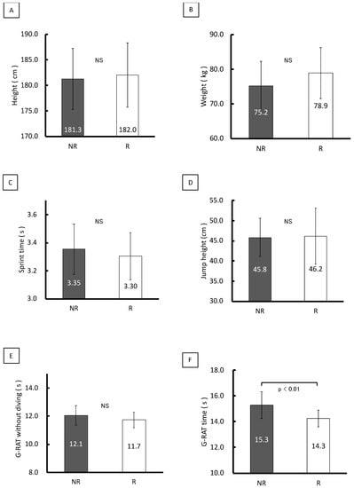 Figure 3 shows test results of the R and NR groups, respectively, regarding height (182.0 ± 6.3 cm vs. 181.3 ± 6.0 cm), weight (78.9 ± 7.4 kg vs. 75.2 ± 7.1 kg), 20 m sprint (3.3 ± 0.2 s vs. 3.4 ± 0.2 s), CMJwA (46.2 ± 7.0 cm vs. 45.8 ± 4.8 cm), simulated G-RAT without diving (11.7 ± 0.6 s vs. 12.1 ± 0.7 s), and G-RAT (14.3 ± 0.7 s vs. 15.3 ± 1.0 s). No significant differences were observed between the R and NR groups in the 20 m sprint, CMJwA, and simulated G-RAT without diving. However, the R group was faster than the NR group in the G-RAT (p < 0.05; Cohen’s d = 0.89).