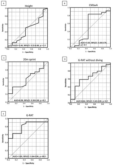 Figure 4 shows AUC plots from ROC analyses. AUC values were not significant in 20 m sprint (AUC, 0.59; 95%CI, 0.38–0.80), CMJwA (AUC, 0.53; 95%CI, 0.26–0.79), body height (AUC, 0.45; 95%CI, 0.22–0.68) and simulated G-RAT without diving (AUC, 0.64; 95%CI, 0.43–0.85). However, only the AUC of G-RAT was statistically significant at 0.80 (95%CI, 0.64–0.96, p < 0.01). In addition, the cut-off time of G-RAT for game participation was 15.0 s.