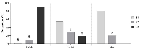 In total, players spent 2230 ± 117 min in 32 training sessions, of which 23 were TE-TA and 9 were S&C. The percentages of the number of training sessions and matches carried out in the three intensity zones are presented in Figure 1. The highest percentage of Z3 was determined during the matches, where Z1 and Z2 were lower than Z3. For TE-TA training session, the significant difference in training session distribution across intensity was also determined, in which Z2 and Z3 were lower than Z1. The players did not spend any of the S&C in Z3, but a significant number of sessions were performed in Z1. According to the distribution observed for the combined TE-TA and S&C training sessions, players performed approximately 61, 25, and 14% in low, moderate, and high intensity, respectively.
