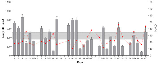 Daily internal training intensity (ITI) observed over the 35 days of the pre-season phase (5 weeks). The grey area represents the smallest worthwhile change (SWC = coefficient of variation × 0.3), and the error bars show 90% confidence limits (CL). If the CL crossed one or both SWC boundaries, the terms “possibly” and “unclear” were used, respectively. The red line represents within-days intensity variations (CV%). MD—match day.