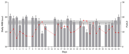 Daily well-being status index (WBI) observed over the 35 days of the pre-season (5 weeks). The grey area represents the smallest worthwhile change (SWC = coefficient of variation × 0.3), and the error bars show 90% confidence limits (CL). If the CL crossed one or both SWC boundaries, the terms “possibly” and “unclear” were used, respectively. The red line represents within-days well-being status variations (CV%).
