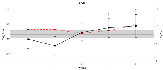 Countermovement jump (CMJ) height observed over the 5 weeks of the pre-season phase. The grey area represents the smallest worthwhile change (SWC = coefficient of variation × 0.3), and the error bars show 90% confidence limits (CL). If the CL crossed one or both SWC boundaries, the terms “possibly” and “unclear” were used, respectively. The red line represents within-weeks CMJ variations (CV%); #—significantly higher than W1.