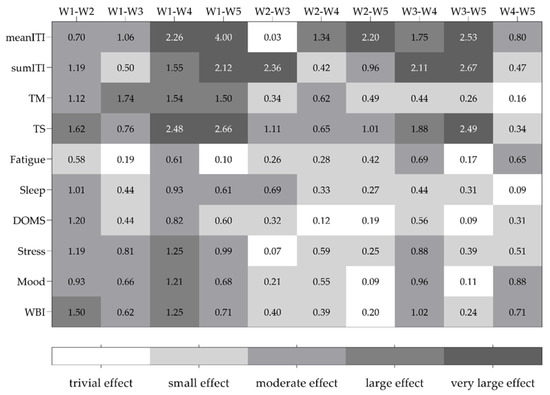 Measures of magnitude for multiple comparisons between weeks in ITI and well-being status measures are presented in Figure 5. Large to very large effects are found for both meanITI and sumITI for the week 1 vs. week 5 and week 3 vs. week 5 pairwise comparisons. Lower values (trivial to moderate effect) were found for the well-being status domains sleep and DOMS.