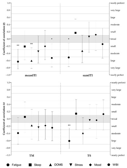 Coefficients of correlation (r) determined between internal intensity and well-being status measures; meanITI—average weekly internal intensity; sumITI—accumulated weekly internal intensity; TM—training monotony, TS—training strain; DOMS—delayed onset of muscle soreness; WBI—well-being status index. Error bars represent 90% confidence limits (CL); *—significance at p < 0.05; **—significance at p < 0.01.