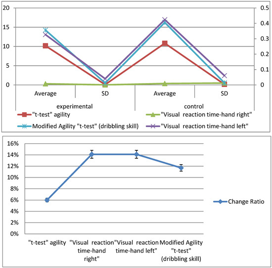 These differences are due to the nature of the device used to perform training. As a modern method of training, physical and skill training is characterized by fast and short movements. The differences are further due to the nature of the training used in the research, which had controlled performance times and rest periods. These periods have a great impact on the recovery of athletes, which is significant in the development of players’ performance levels. Changes in the components of the training load and the diversity of the training cause the excitement of new muscle fibers during periods of rest. This will increase the size of the muscles used in the training [43], resulting in the development of motor compatibility of the eyes, legs, and hands. The player’s skill within the exercises depended on this coordination, as the light signal forced them to move in fast and short steps, as well to use their hands to turn off the light.