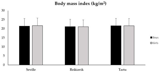 Regarding the height of the participants (Table 2), statistically significant differences for the variables of city (F = 114.840; p < 0.001; = 0.118) and gender (F = 221.705; p < 0.001; = 0.115) were found, with statistically lower values in Seville and Reykjavik in comparison to Tartu, both for boys (p < 0.001) and girls (p < 0.001). Concerning weight according to city (F = 30.480; p < 0.001; = 0.034) and gender, statistically significant differences were also observed, being higher in boys than in girls (F = 52.100; p < 0.001; = 0.030). However, unlike the variables of height and weight, when analyzing the differences in BMI, no statistically significant differences were observed neither for the city (F = 1.896; p = 0.150; = 0.002) nor for gender (F = 0.112; p = 0.738 < 0.001) (see Figure 1).